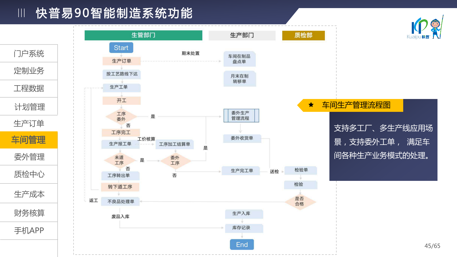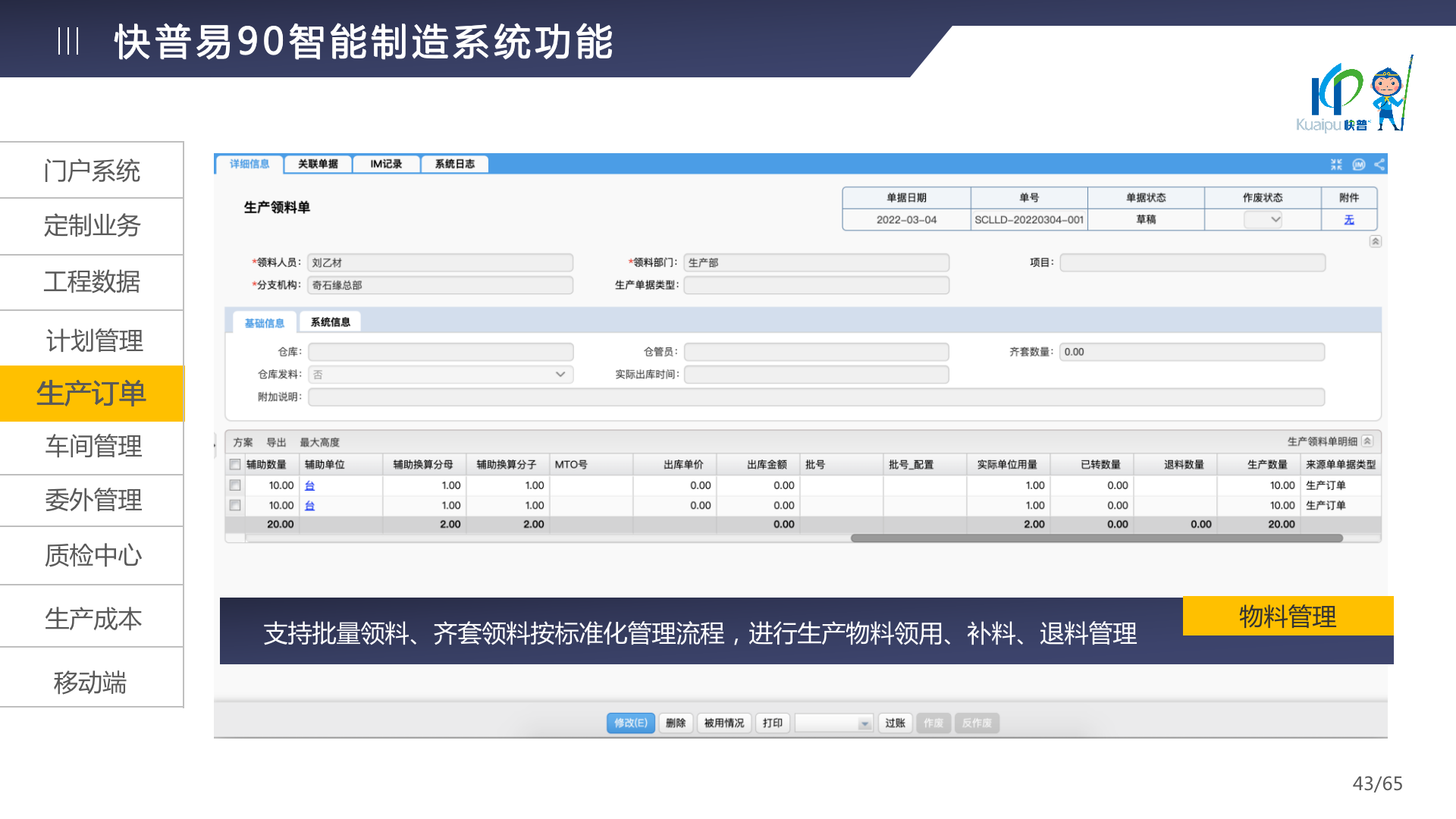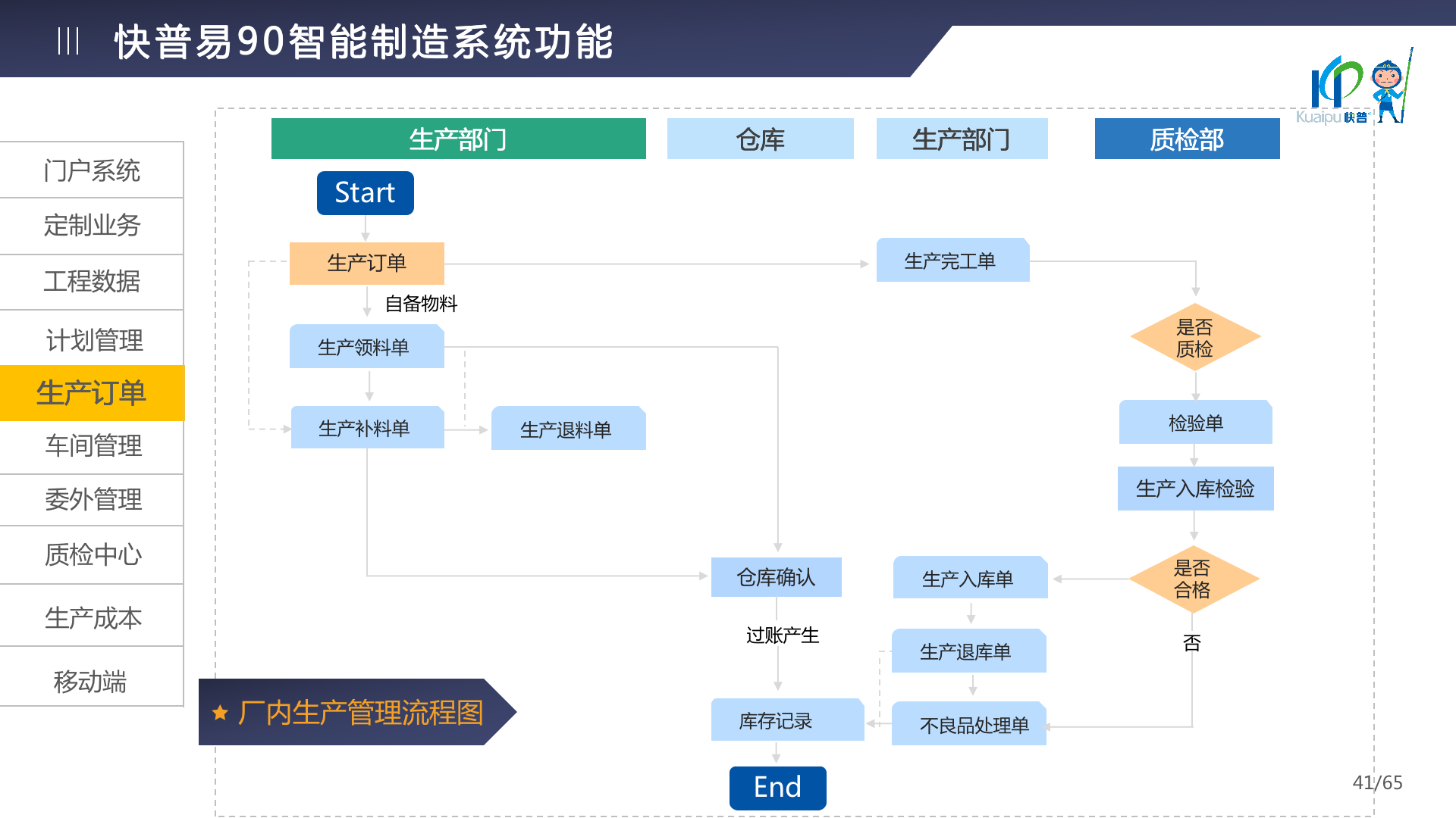 快普易90融合了大量精益生產(chǎn)管理的經(jīng)驗(yàn),涵蓋計(jì)劃管理、BOM管理、MRP運(yùn)算、生產(chǎn)訂單管理、供應(yīng)鏈管理、車間管理、出入庫管理、委外管理、質(zhì)量管理、生產(chǎn)成本核算、報(bào)表分析等全面生產(chǎn)管理,為企業(yè)打造實(shí)時(shí)感知變化、分析變化、提供決策的數(shù)字化管理平臺,推動企業(yè)創(chuàng)新的管理,實(shí)現(xiàn)“智能制造”的數(shù)字化轉(zhuǎn)型。
