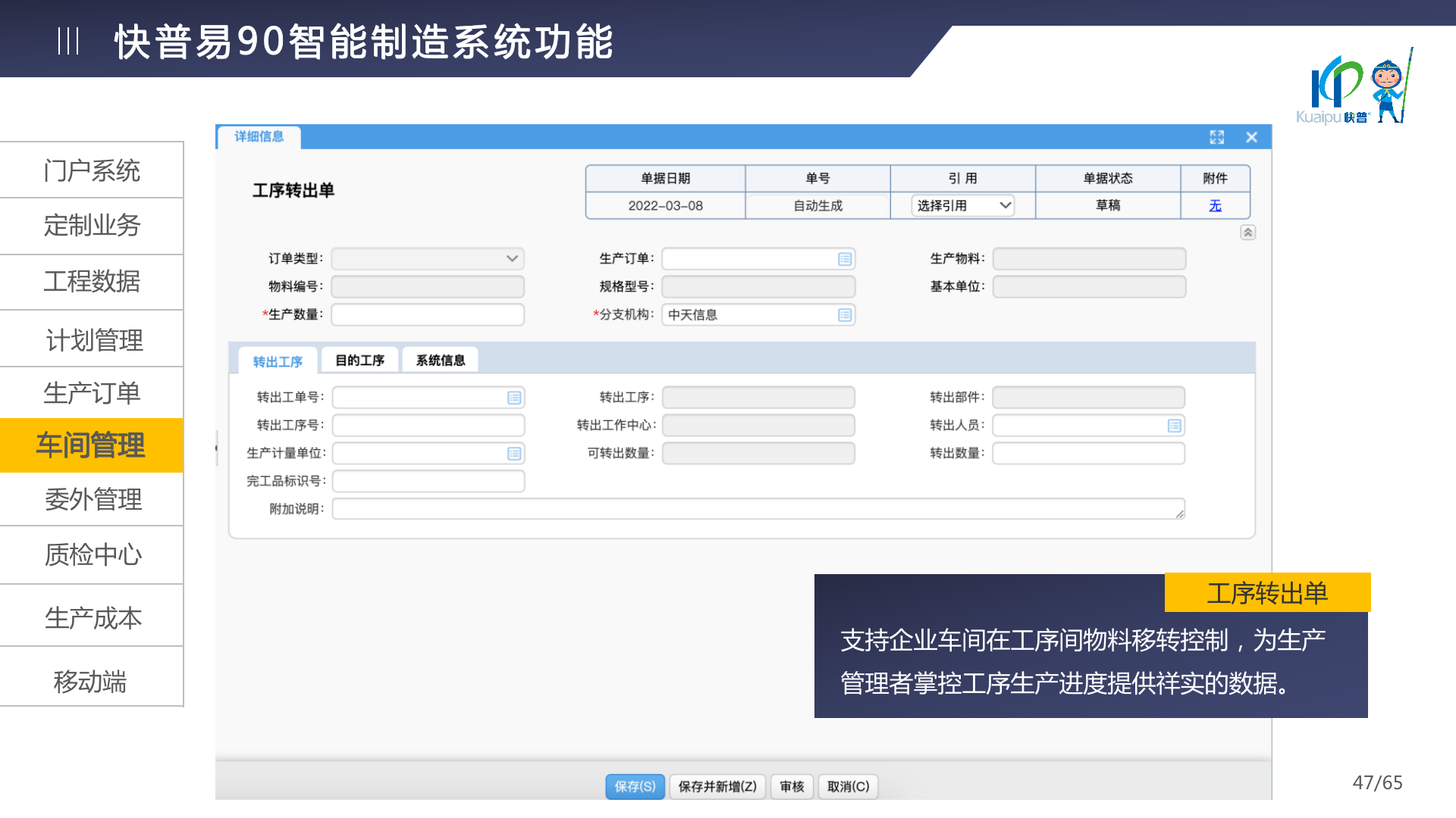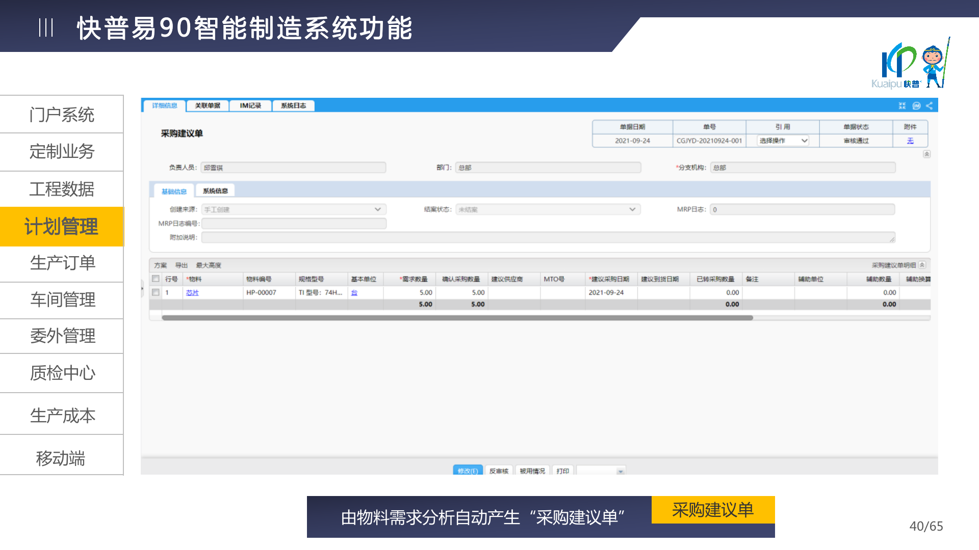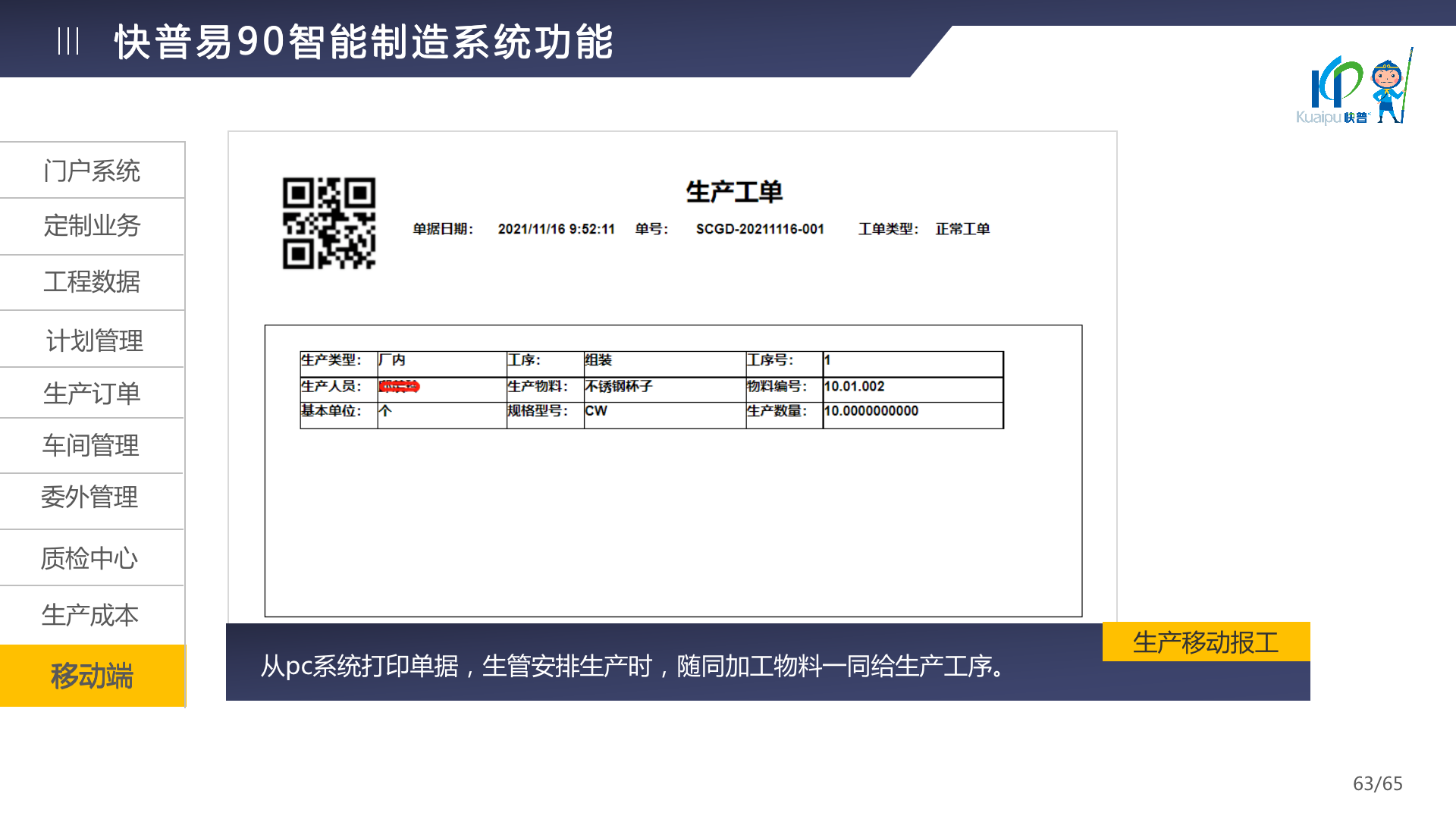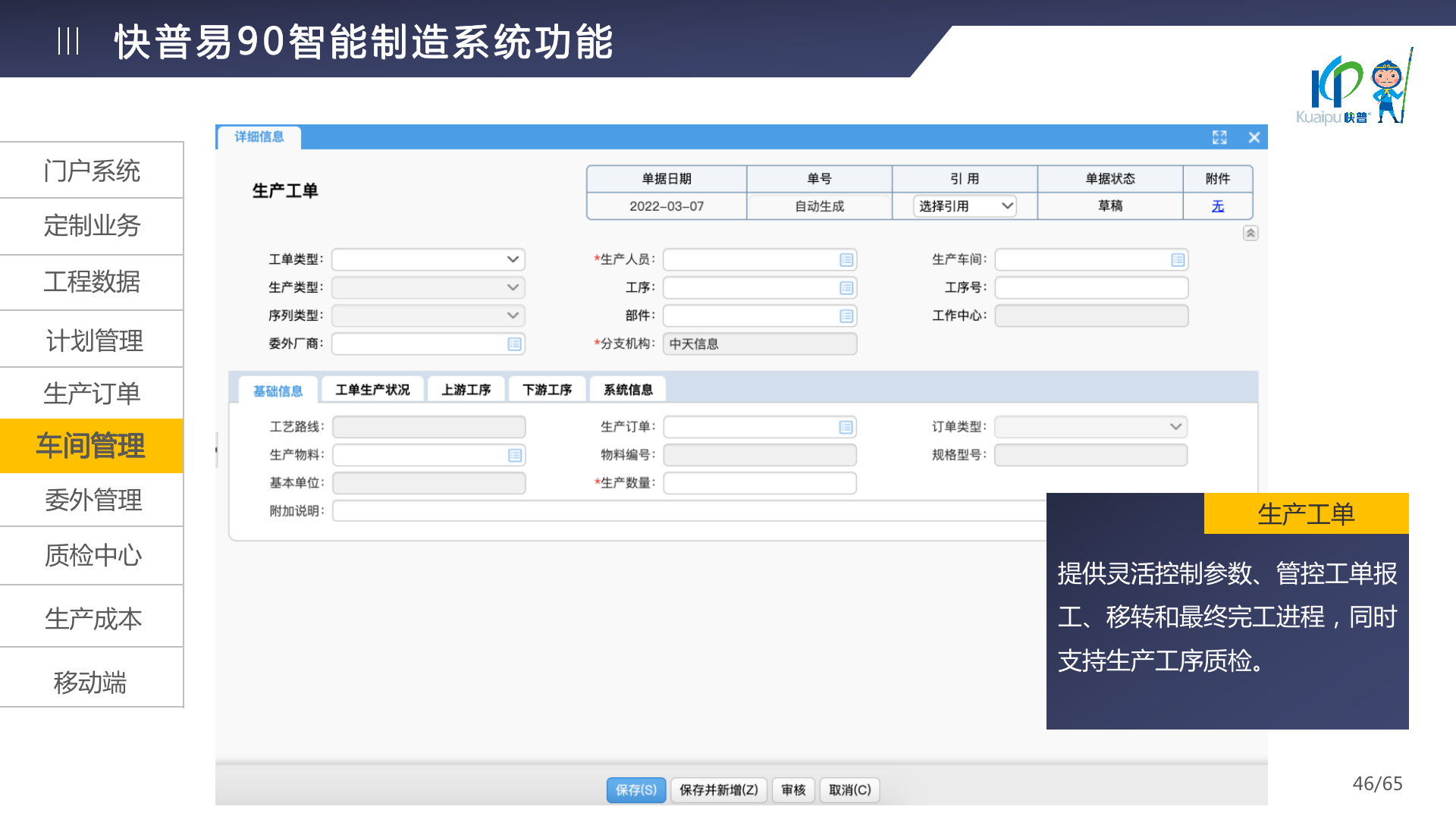 快普易90融合了大量精益生產(chǎn)管理的經(jīng)驗(yàn),涵蓋計(jì)劃管理、BOM管理、MRP運(yùn)算、生產(chǎn)訂單管理、供應(yīng)鏈管理、車間管理、出入庫管理、委外管理、質(zhì)量管理、生產(chǎn)成本核算、報(bào)表分析等全面生產(chǎn)管理,為企業(yè)打造實(shí)時(shí)感知變化、分析變化、提供決策的數(shù)字化管理平臺,推動企業(yè)創(chuàng)新的管理,實(shí)現(xiàn)“智能制造”的數(shù)字化轉(zhuǎn)型。