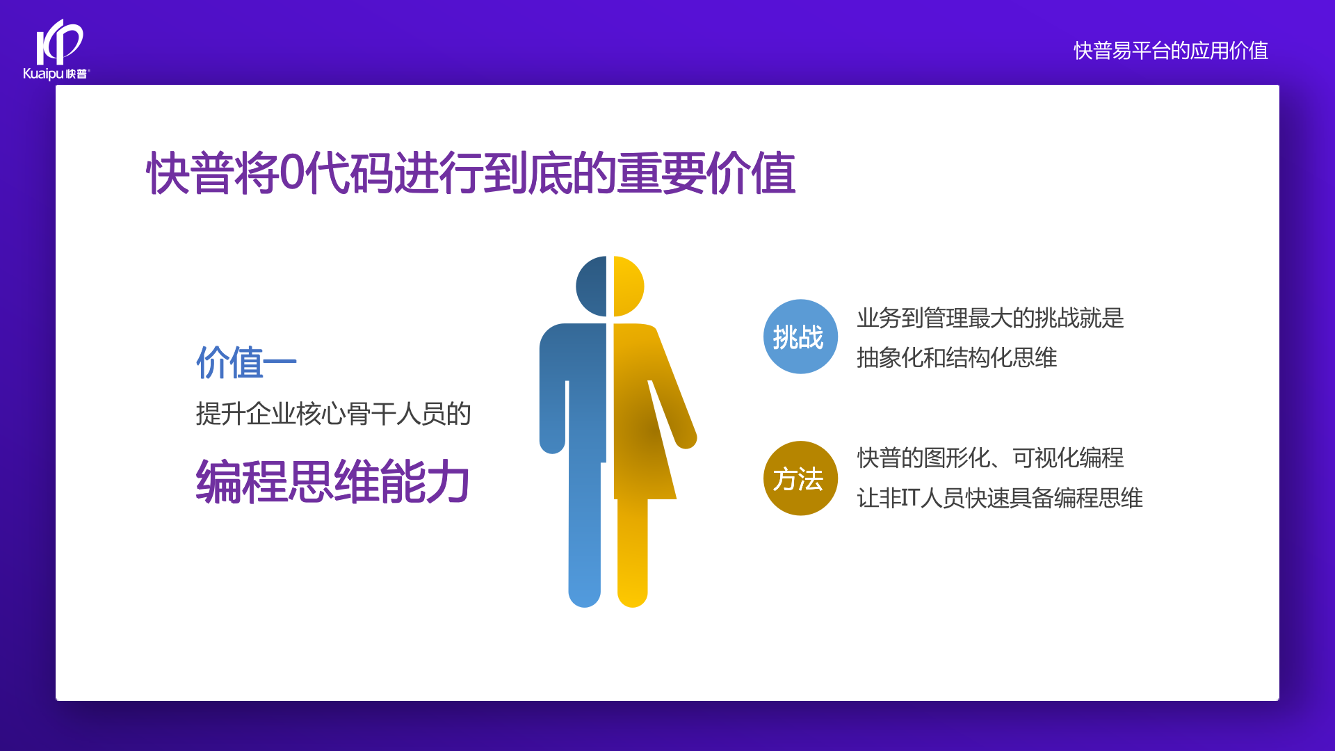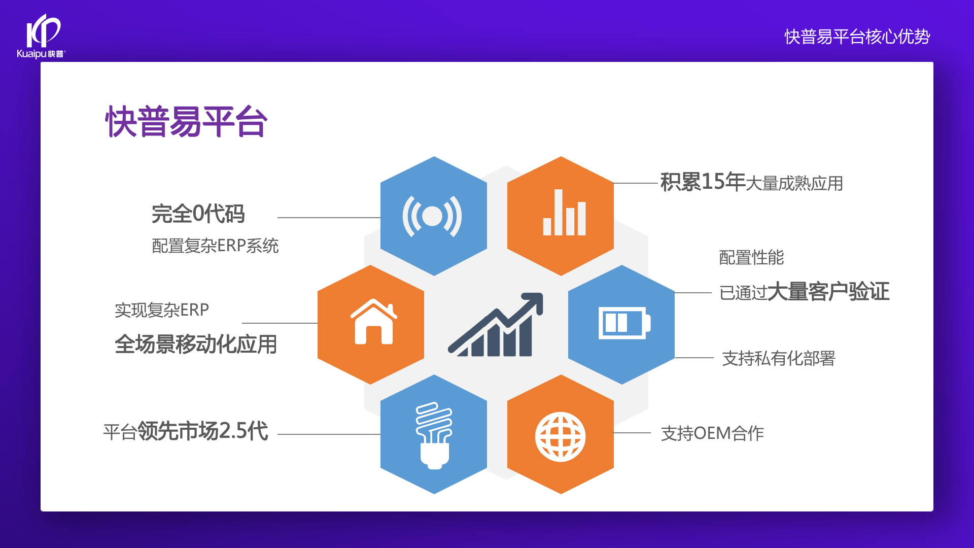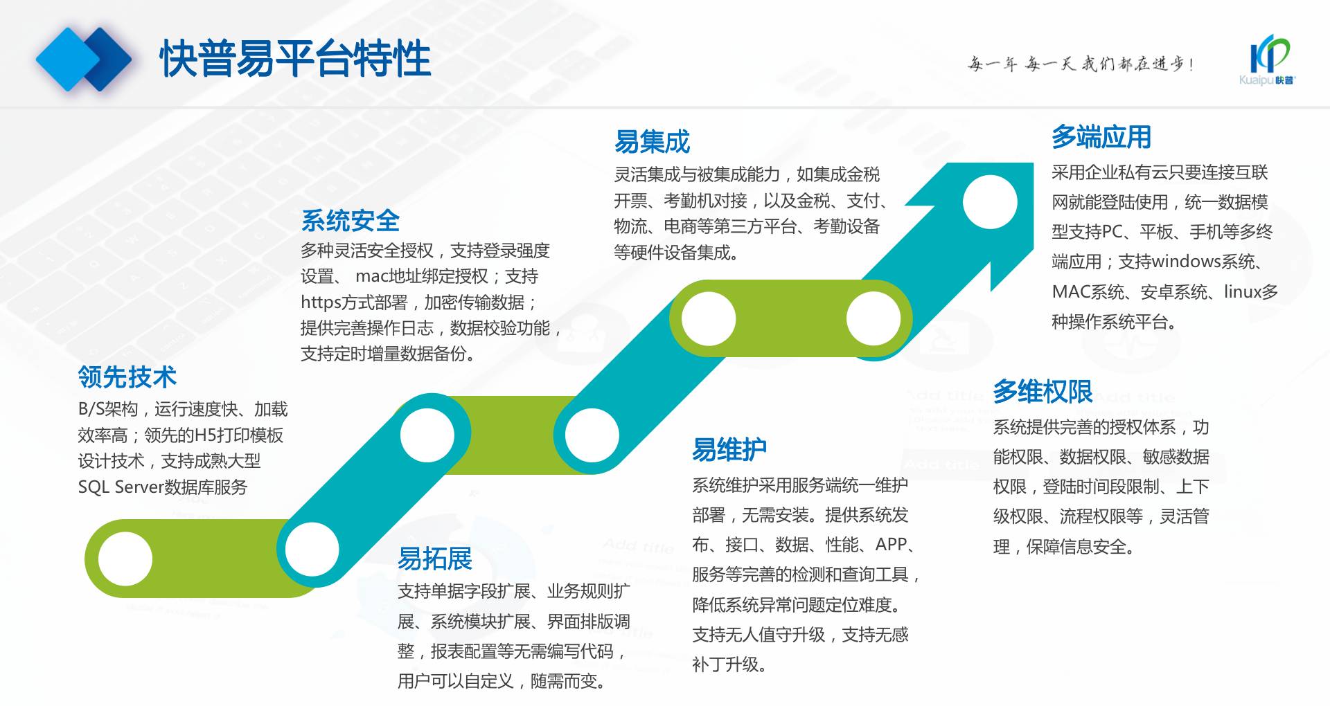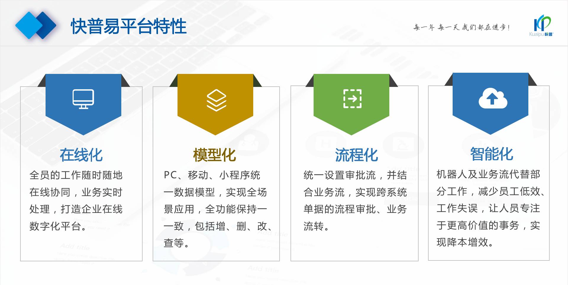 為了解決市場需求與平臺產(chǎn)品瓶頸等矛盾,實(shí)現(xiàn)徹底的零代碼平臺,快普堅(jiān)持理念創(chuàng)新,以理念推動平臺技術(shù)的創(chuàng)新。“以不變應(yīng)萬變”的理念:分析哪些東西未來肯定不變?哪些趨勢未來一定會變?從變化中找出不變的因素,從不變中找出變動的因素;從量變到質(zhì)變,經(jīng)歷萬變總結(jié)抽象出不變的本質(zhì)。基于快普長期的信息化服務(wù)經(jīng)驗(yàn),開發(fā)配置出企業(yè)數(shù)字化轉(zhuǎn)型工具:快普易平臺成功解決了企業(yè)數(shù)字化轉(zhuǎn)型升級面臨的客戶大量個性化需求,真正實(shí)現(xiàn)隨需而變的設(shè)計(jì)理念,大大降低了信息化投入成本,提高信息化效率,幫助企業(yè)實(shí)現(xiàn)自主可控的技術(shù)創(chuàng)新,從而進(jìn)一步推動企業(yè)的業(yè)務(wù)創(chuàng)新和管理創(chuàng)新。
