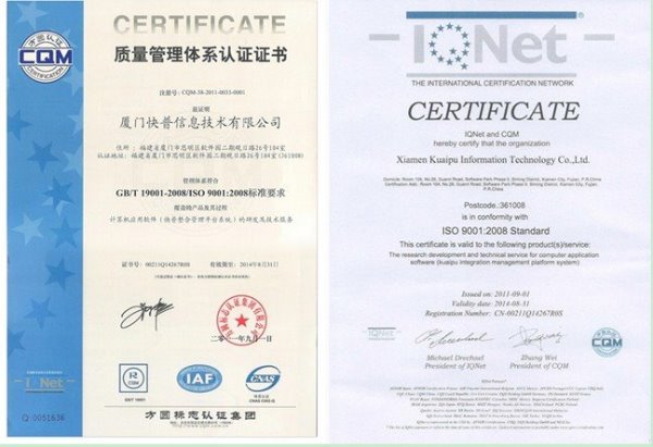 自公司成立起,快普就嚴格按ISO9001質(zhì)量體系標準進行規(guī)范化運作。今年年初快普公司正式引進ISO質(zhì)量管理體系進入輔導(dǎo)期以來,經(jīng)過半年多貫標工作的深入開展,今年8月,審核專家對快普公司質(zhì)量管理體系運行的有效性、符合性給予了高度的評價,一次性便順利通過了方圓認證集團的嚴格審核,并獲得了ISO9001國際質(zhì)量管理體系認證證書。
