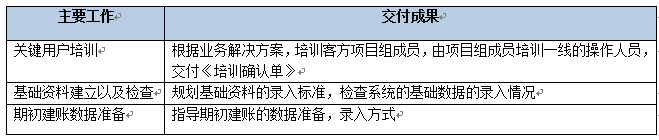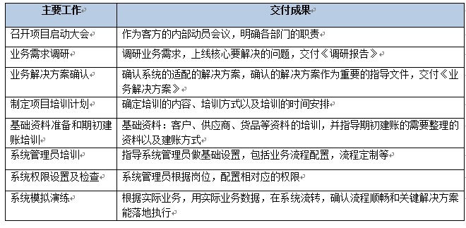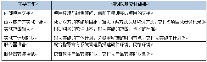 該階段主要是做實(shí)施基礎(chǔ)的搭建,包括完成內(nèi)部交接、確認(rèn)雙方的項(xiàng)目組成員名單、確認(rèn)實(shí)施范圍、確認(rèn)實(shí)施計劃、服務(wù)器準(zhǔn)備以及軟件部署。該階段結(jié)束以《項(xiàng)目啟動階段里程碑確認(rèn)單》作為交付。
