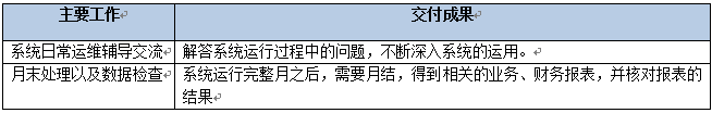 該階段主要是做系統(tǒng)開賬運(yùn)作之后,持續(xù)支持運(yùn)用中出現(xiàn)的所有問題,系統(tǒng)運(yùn)行完整月之后,指導(dǎo)月結(jié),得到相關(guān)的報表數(shù)據(jù)。該階段結(jié)束以《持續(xù)支持里程碑確認(rèn)單》作為交付。