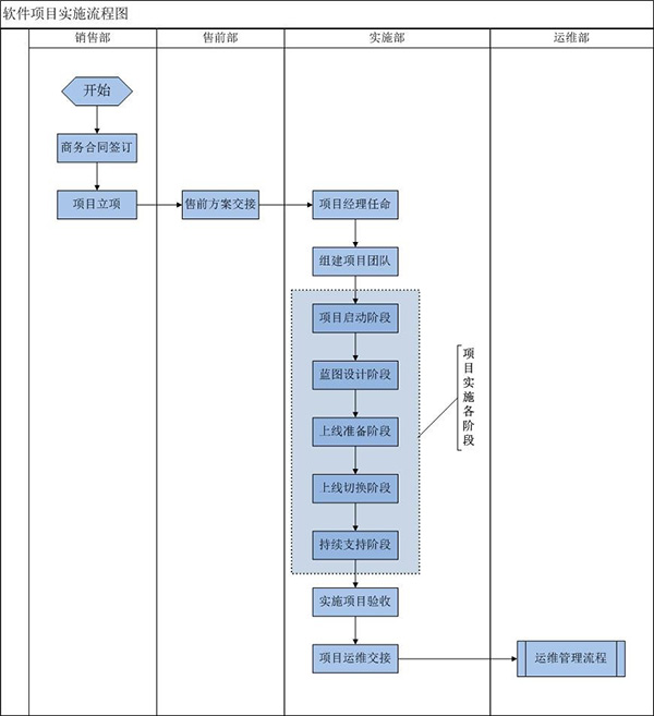 快普軟件項(xiàng)目實(shí)施分為五個階段:項(xiàng)目啟動階段、藍(lán)圖設(shè)計階段、上線準(zhǔn)備階段、上線切換階段、持續(xù)支持階段。每個階段都有對應(yīng)的階段交付成果。完成這五個階段的任務(wù)之后,進(jìn)入實(shí)施項(xiàng)目驗(yàn)收階段。實(shí)施驗(yàn)收完成之后,轉(zhuǎn)入運(yùn)維部門,實(shí)施過程結(jié)束。